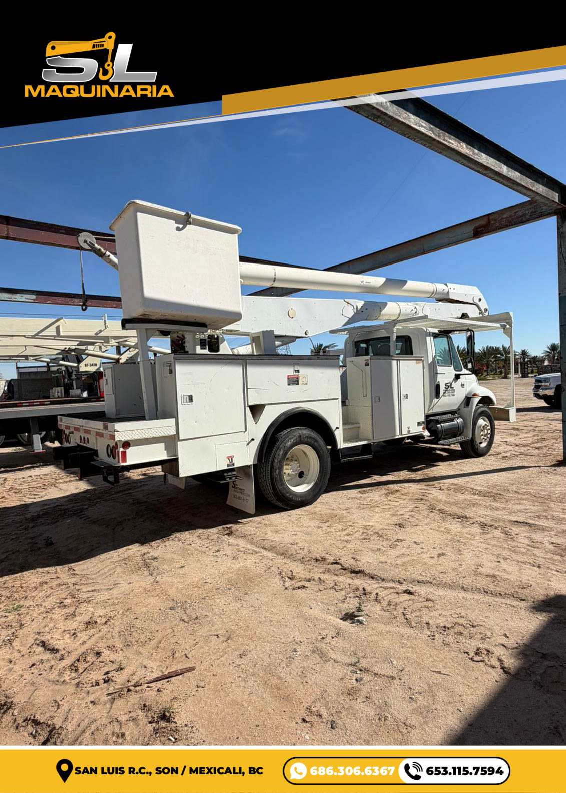 Canastilla aérea International con pluma Altec de 60 pies, año 2006. Gran alcance en altura para trabajos exigentes en líneas eléctricas y telecomunicaciones.